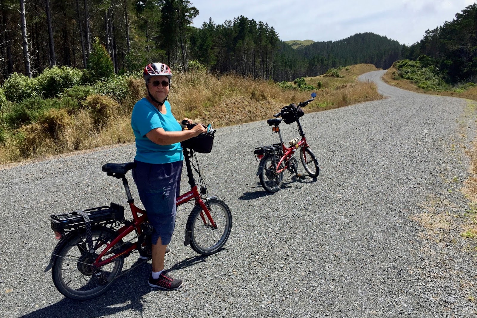 Before we got to the intersection with Rifle Range Road and Takarau Gorge Road, we met Alastair Smith (of Folding Goldies fame) going the other way. We stopped to talk. It was good to see him, as he had not been able to make it to our last Folding Goldies ride in November, because he wasn’t well. Today he had come into Ohariu from the Karori end, and was biking to Johnsonville, and planning to go down the Ngauranga Gorge.