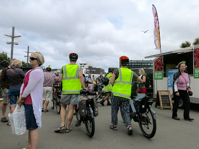 Because it was quite busy along the front of Frank Kitts Park, Ryan asked us not to turn on the electric assist until we got to the bridge over the lagoon. Very sensible, especially for those people not yet used to e-biking. And we were told we should dismount near Waitangi Park, where the Sunday market was still in full swing.
