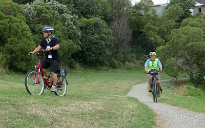 We stopped on a stretch of lawn close to Hataitai Beach, and Ryan had a a game for us to take part in: Bicycle Limbo. Does anyone remember the Limbo dance craze of the 1960s? Chubby Checker and his “Limbo Rock”? No? Well, I guess I am showing my age ...