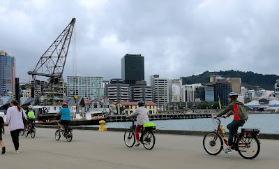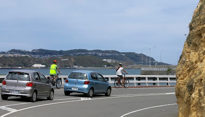 Sofia stopped the traffic as we streamed from Herd Street into Oriental Parade, where we biked on the road rather than on the shared foot/cycle path. We pedalled along at a fair clip – thanks to our e-assist – until just past Cog Park on Evans Bay Parade. The northerly was quite strong, and it got quite fierce around some of the points along the way. I was very glad of my e-assist!